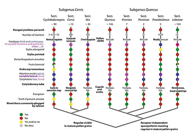 Revised sectional classification of oaks and diagnostic characters of lineages. The basic phylogenetic relationships of the six infrageneric groups of oaks are shown, formalized here as sections in two monophyletic subgenera, subgenus Cerris and subgenus Quercus. Section-specific traits in bold; subgenus-diagnostic traits indicated at the respective branches of the schematic phylogenetic tree. Note «yes» (green) and «no» (red) refers to whether the mentioned trait is observed or not in members of section but should not be generally viewed as derived or ancestral (Denk, et al., 2017).